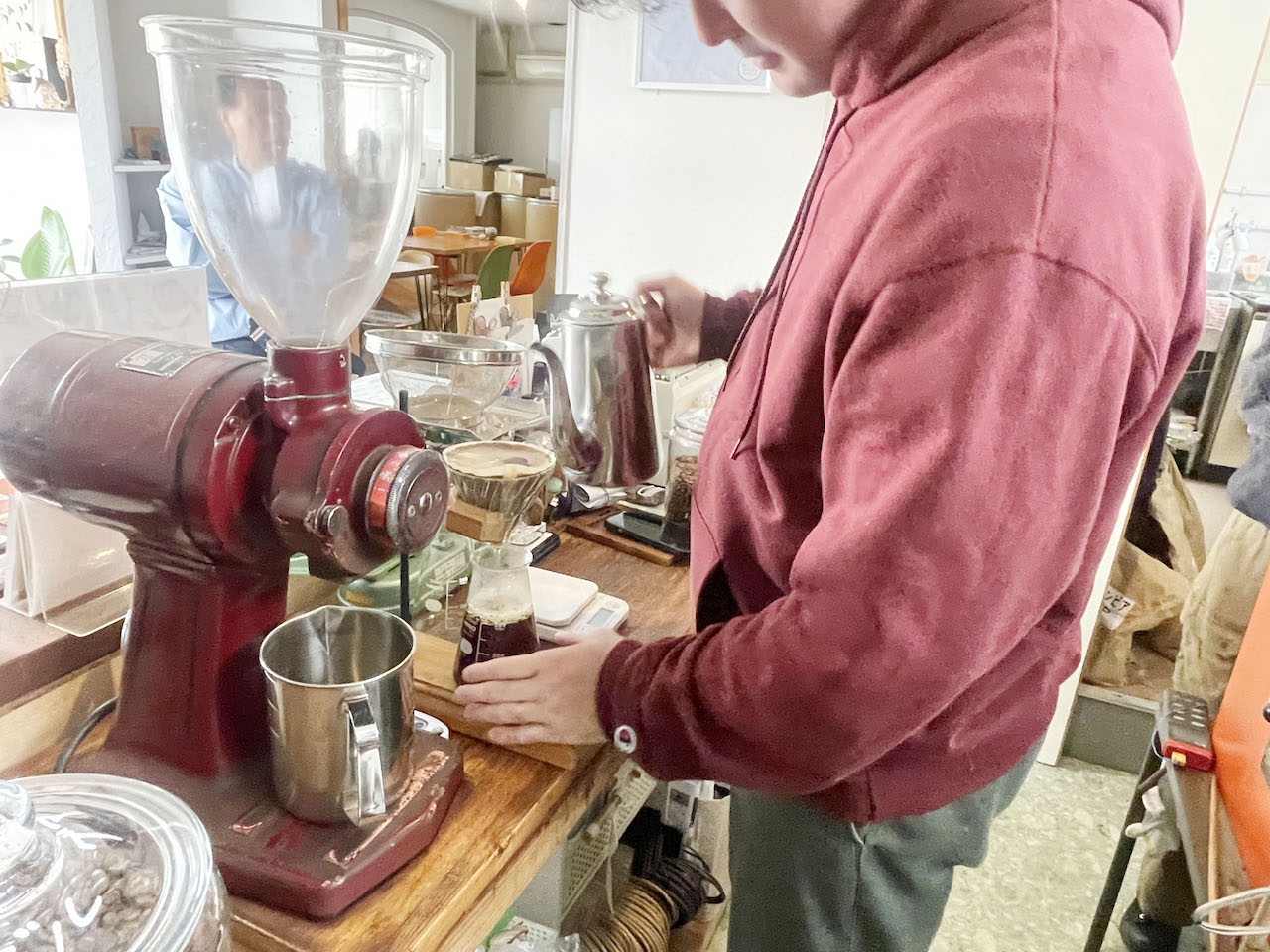取材中、お店を訪れるお客さんに遭遇。みなさんなんだかウキウキしていました。楽しそうにご当地グルメについて世間話をする人もいれば、「この間買った豆はこう感じたよ」「淹れ方この方がいいかもです」などと、コーヒー談義に花が咲く場面も。