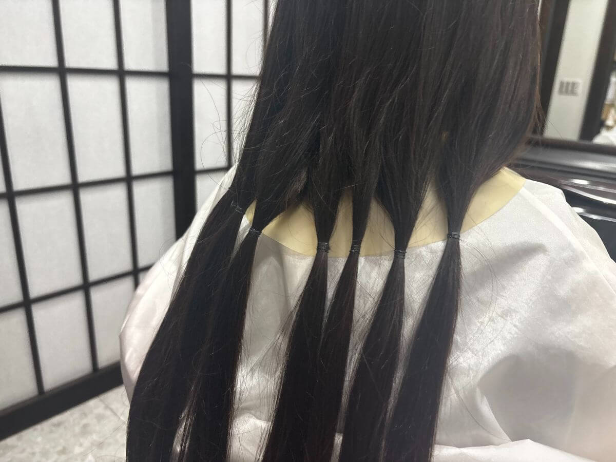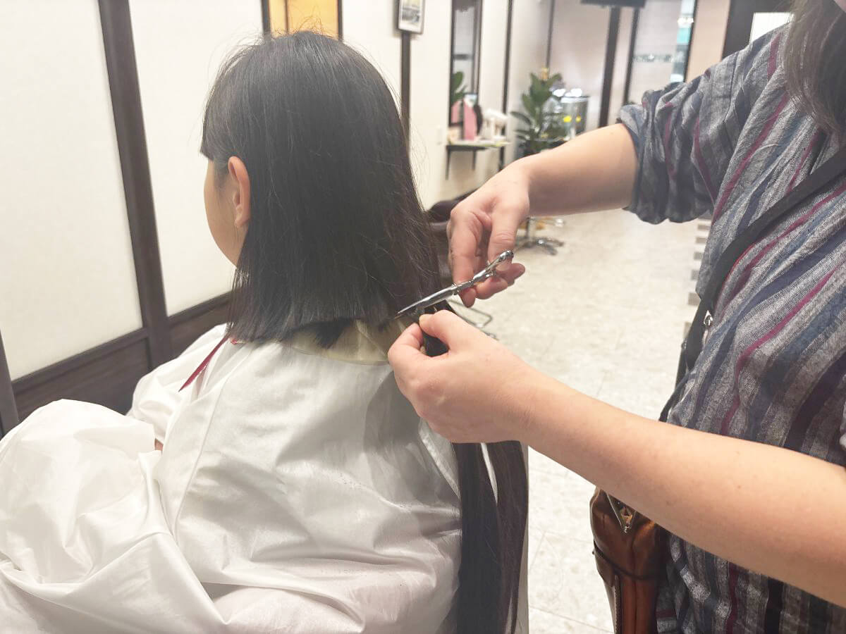 ヘアドネーションは、通常のカットとまったく同じというわけではありません。ハサミを入れる位置を確認したり、毛束を丁寧に分けて束ねたりと、ひとつひとつの工程に時間がかかるため、カット時間は通常より15〜20分ほど長くなるそうです(髪の量によって前後します)。