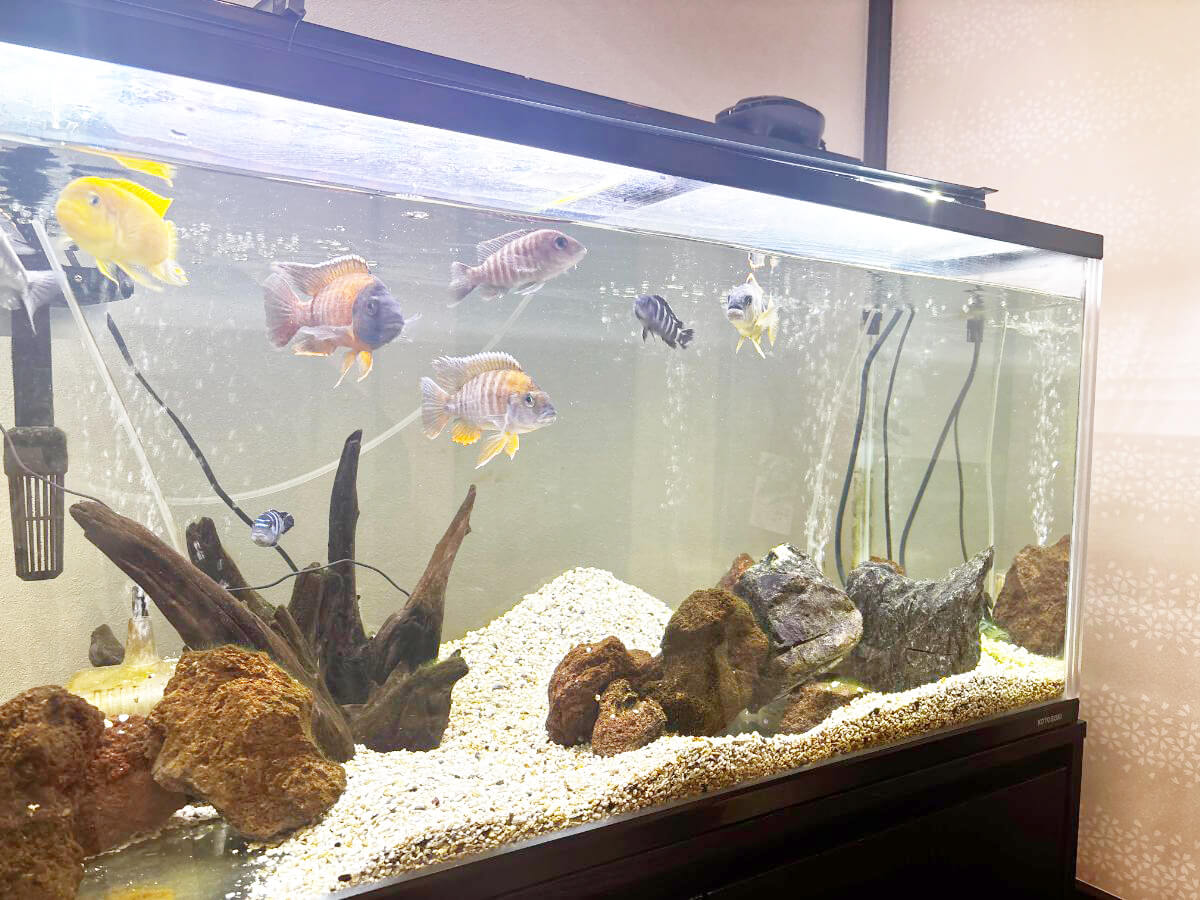 店内には大きな水槽もあり、元気に泳ぐ魚たちの姿が。小さなお子さんのカット時には、水槽の前で対応することもあるそうです。