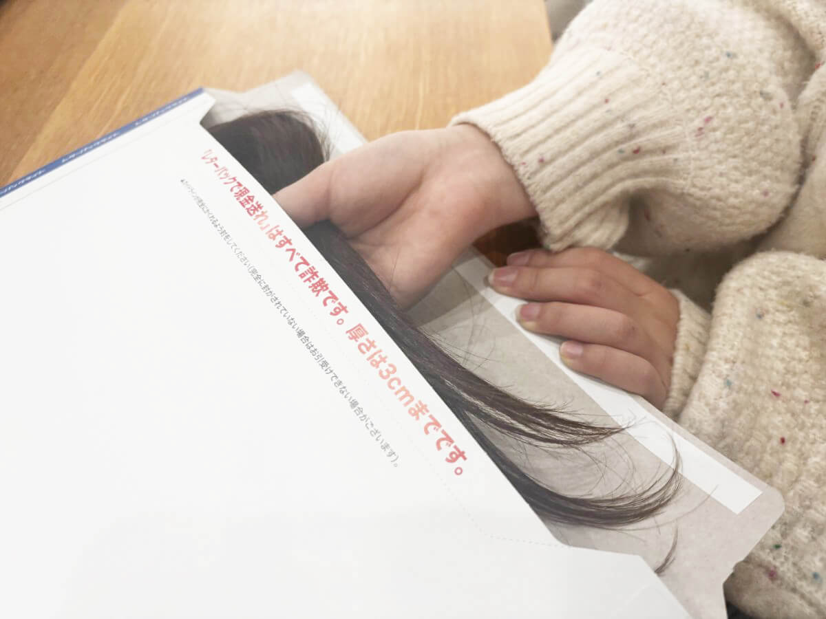 持ち帰った髪の毛は、そのままレターパックに入れて郵送しました。美容院から送っていただくこともできるので、「自分でするのは不安」という場合でも安心です。
