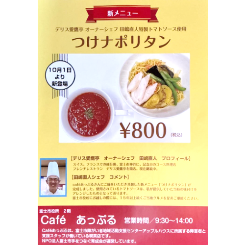 デリス愛鷹亭オーナーシェフ田嶋直人さん特製のトマトソースを使用した新メニュー『つけナポリタン』のご提供が始まりました。